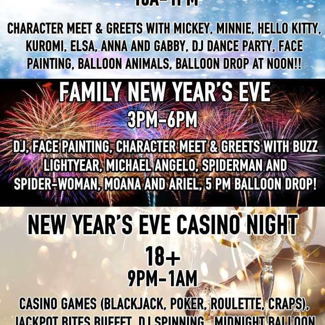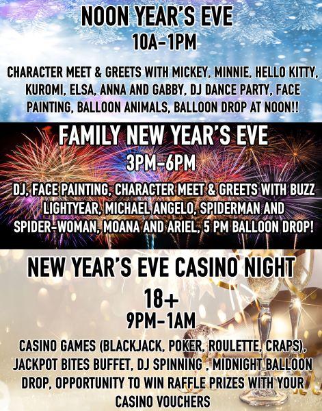 🕒 Time: Noon Years Eve 10AM-1PM, Early Eve Extravaganza 3PM - 6PM, & New Year's Eve Casino Night 9PM - 1AM