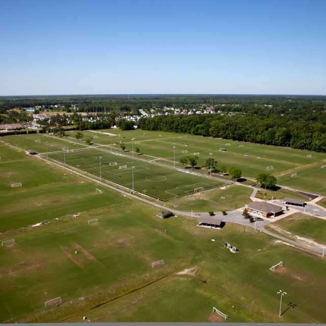 More than 50,000 out-of-town visitors set foot on these fields each year. Opened in 1990, the outdoor, 75-acre soccer mecca that features: 24 soccer fields (22 Bermuda grass and 2 artificial turf fields with lights), One turf field has stadium seating for 260 spectators, 2500 sq. ft. brick building for meeting and tournament headquarters, Athletic trainers and training room, 2 restroom facilities, 2 concession stands, 4 picnic pavilions, 2 parking lots with 700 spaces, including 16 permitted spots for tournament staff or VIP’s. It's located less than one mile from the Virginia Beach SportsPlex.