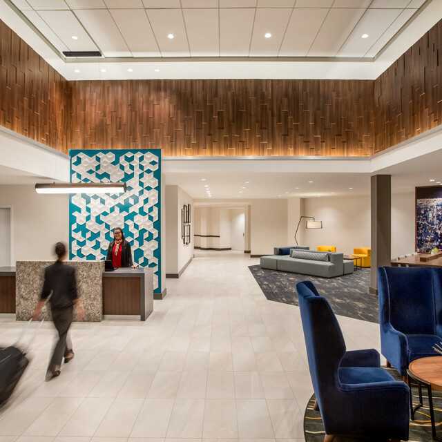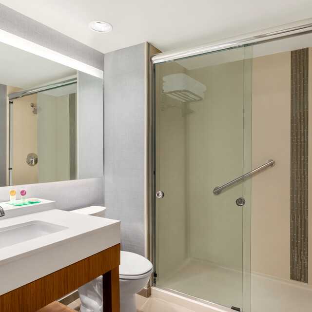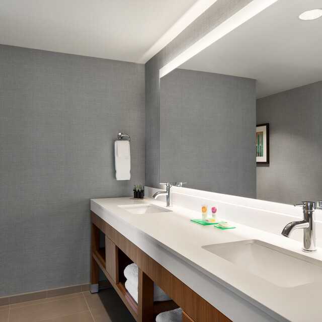 Spacious guestrooms offer flexible workspace and areas to relax with a separate living area featuring a Cozy Corner sectional sofa sleeper. Additionally, all bathrooms are nicely appointed with a roomy walk-in shower and oversized eco-quartz vanity with one sink. Guest bathrooms also feature a dressing area, large closets and complimentary upgraded bath and body products, including Aquafresh® toothpaste.