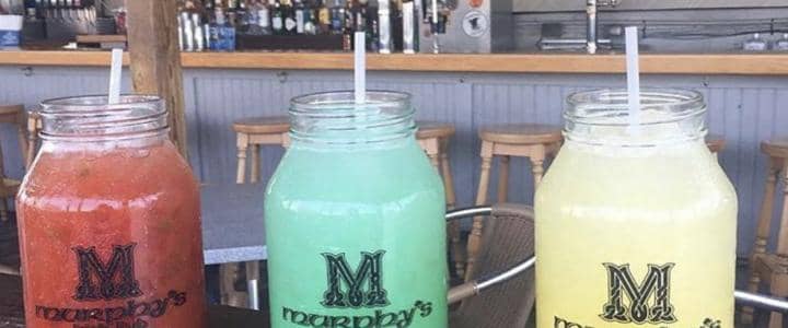 Three large glass jars filled with red, green, and yellow frozen drinks, each with a straw, on an outdoor table in front of a bar.