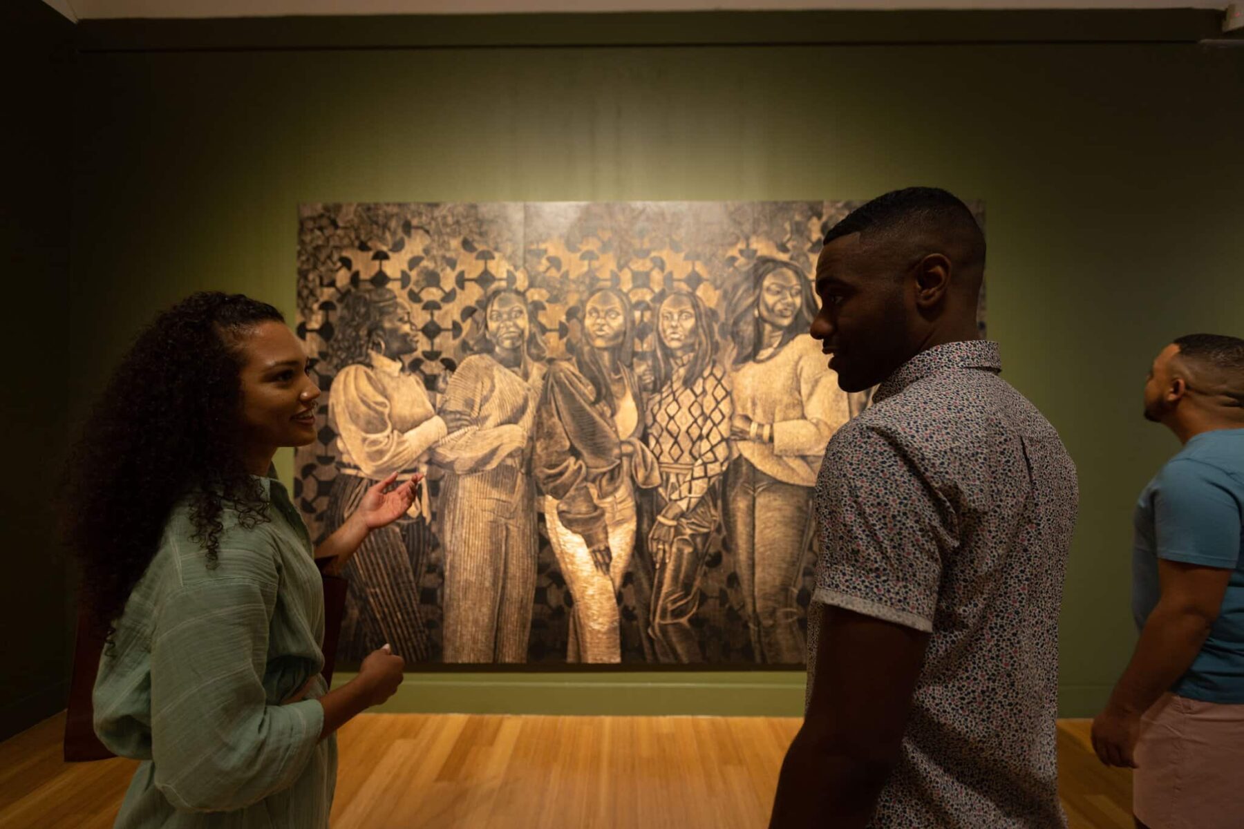 Three people view a large, detailed painting of a group of figures in a museum or gallery with green walls and wooden floors.
