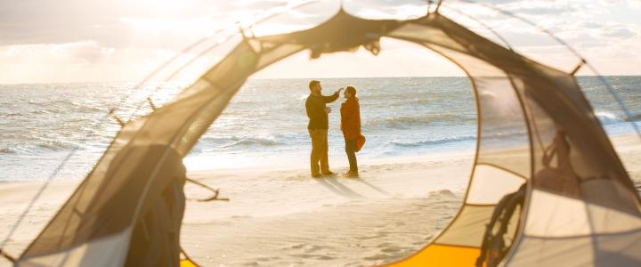 View from a tent of two people standing on a beach, facing each other, with ocean waves in the background under a bright, cloudy sky.