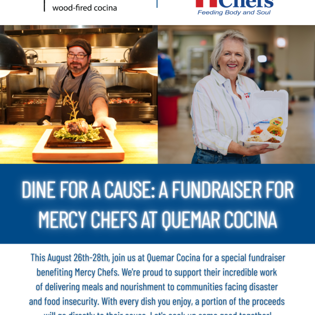 This August 26th-28th, join us at Quemar Cocina for a special fundraiser benefiting Mercy Chefs. We're proud to support their incredible work of delivering meals and nourishment to communities facing disaster and food insecurity. With every dish you enjoy, a portion of the proceeds will go directly to their cause. Let's cook up some good together!