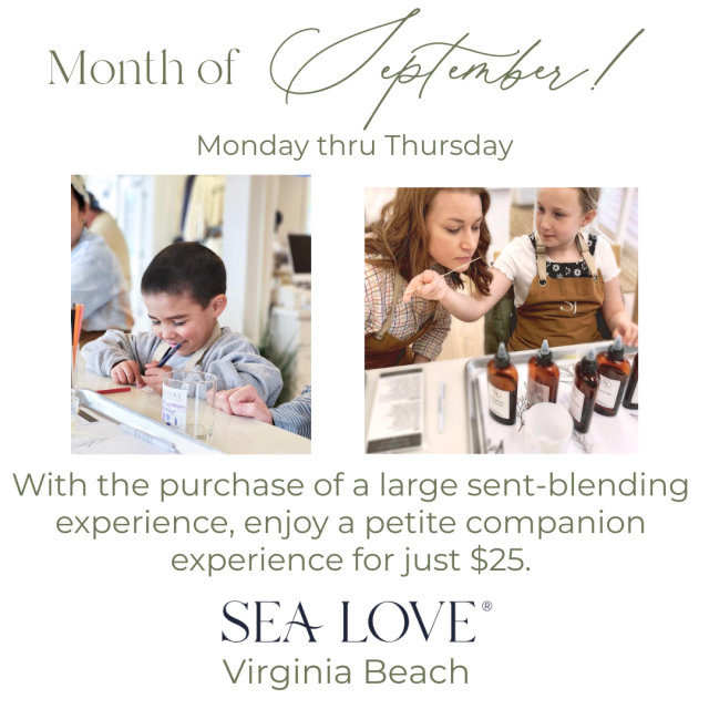 Join us this month for a fun and relaxing scent-blending experience. Custom create your very own candle or reed diffuser! Book now or walk-in! Located in the La Promenade Shoppes of Virginia Beach