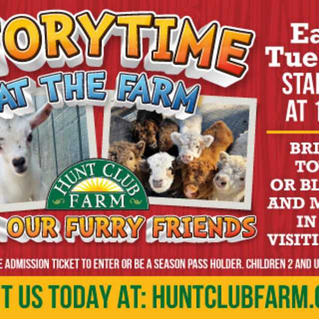 Bring the kids and enjoy Storytime at Hunt Club Farm every Tuesday at 11 AM — happening on 4/29, 5/6, 5/13, 5/20, and 5/27. Cozy up with a towel or blanket in the Visiting Pen and meet some of our furry farm friends while enjoying fun, interactive stories. Admission or a season pass is required (children 2 and under are free).