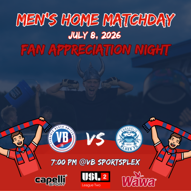 VB United closes out the home slate on July 8 with a special Fan Appreciation Night as they take on Annapolis Blues FC. This night is all about giving back to the incredible supporters who bring energy and passion to every match. Fans can expect a fun-filled atmosphere as the team looks to put on a show and thank the community for their continued support. Don't miss this exciting night dedicated to the heartbeat of VB United—our fans.