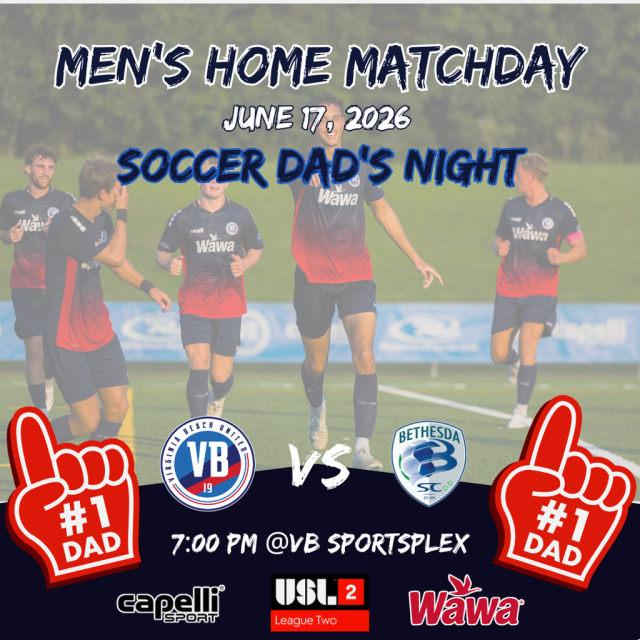 VB United returns home on June 17 for Soccer Dad's Night as they face Bethesda SC at the VB Sportsplex. This special night is dedicated to all the dad's who support, coach, and cheer from the sidelines. With a fun and family-friendly atmosphere, it's the perfect opportunity to celebrate the role dads play in the soccer community while enjoying an exciting match under the lights.