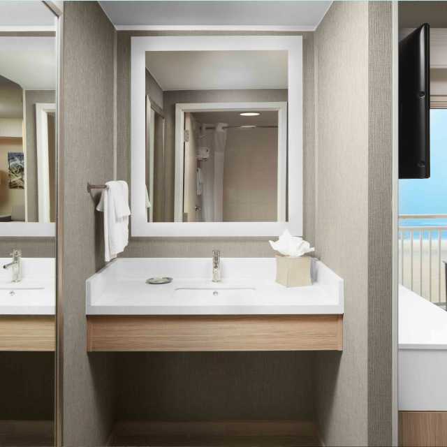 Relax and rejuvenate at the SpringHill Suites by Marriott Virginia Beach Oceanfront. Our all oceanfront suite hotel is located on the boardwalk and is a breath of fresh air. Each oceanfront suite comes complete with a private balcony, amazing view, free high-speed Internet, 2 TVs, sofa bed, and kitchenette. Enjoy our complimentary new breakfast with fresh choices and a variety of hot and healthy options. Take the stress out of travel with a workout in our fitness center, an exhilarating swim in the heated indoor pool, or a jog on the beach. Refresh poolside at our seasonal outdoor pool bar and grill overlooking the Atlantic Ocean. When planning team building, a rehearsal dinner, or a family reunion, the SpringHill Suites by Marriott Virginia Beach Oceanfront function space perfectly accommodates up to 80 guests. Ideal for Virginia Beach vacations, our oceanfront hotel lets you unwind and cherish every moment.
