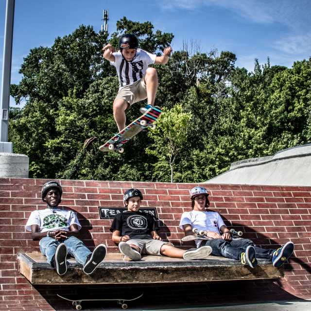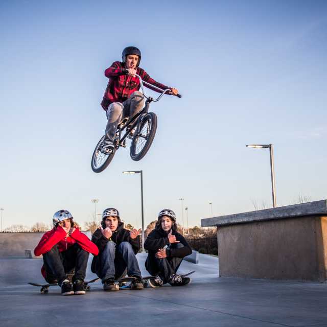 Williams Farm Skate Park is a 25,000 square foot, concrete skate park that features a tiered bowl, flow park and urban skate plaza with LED lighting.