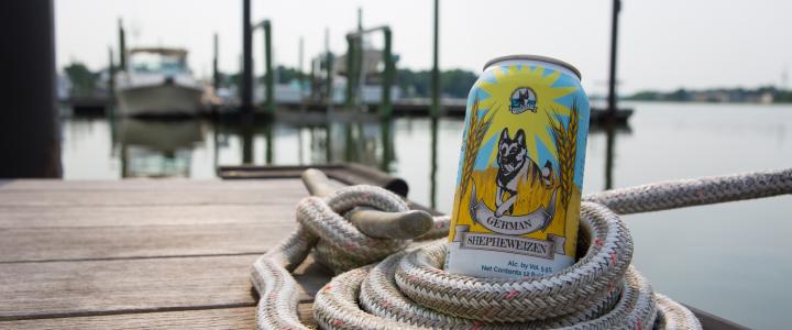 A can of "German Shepherdweizen" beer on a wooden dock surrounded by coiled rope, with boats moored on a calm waterfront in the background.