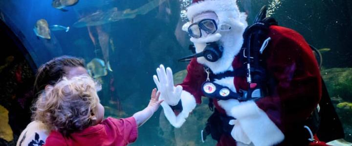 Child high-fives a scuba-diving Santa Claus inside an aquarium, with fish swimming in the background.